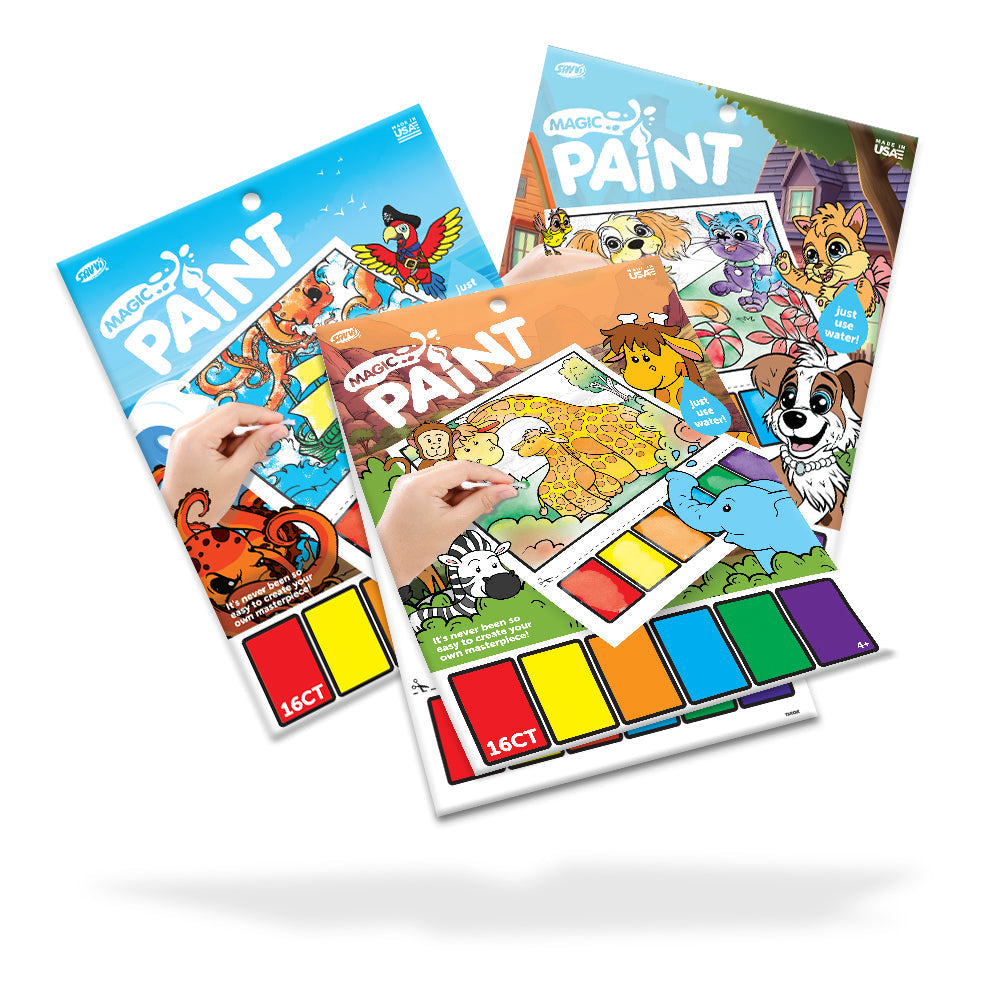 Create your own magical masterpiece with our Magic Paint Products! Each sheet has its own magic paint palette that is activated by water. No need to worry about not having enough paint!
